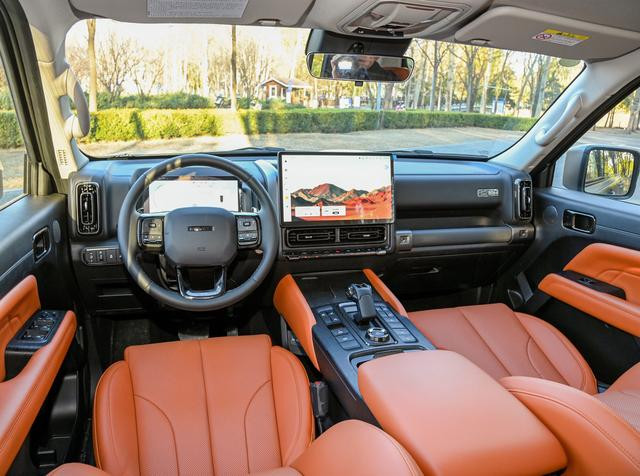 从它的外不雅来看,许多东说念主嘲谑它是大尺寸版块的哈弗猛龙,硬朗中带着几分守旧气味。前脸聘请了大批横平竖直的线条勾画,粗鲁有劲的银色横幅式遮挡条两侧加入了铆钉盘算,前舱盖朝上拱起,立体感更强。配备了两侧正方形的前大灯,里面融入了矩形LED光带、圆环形的LED光带和LED遐迩光灯,赋予其硬派的视觉后果。前保障杠聘请咬合式盘算,下部配备了护板,两侧配备了小尺寸的圆形雾灯,统共这个词前脸看上去愈加守旧、硬派。车尾也聘请了清廉的轮廓,配备了全尺寸外挂式备胎,两侧尾灯盘算也极具艺术感,耸立式陈设的正方形光源也更具辨识度。粗鲁的后保障杠也加入了小尺寸横置式雾灯,尾门上方还有高位刹车灯,许多硬派越野车的盘算,让东说念主爱不忍释。