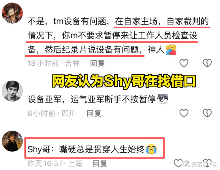 网友们听到这些话亦然纷繁给出了他们的认识,有网友说说念:“开拓有问题,在自家主场自家裁判的情况下,为什么不条件暂停让使命主说念主员检查开拓?而在赛后记载片中说开拓的问题。”还有网友认为这是TheShy在为输比赛找的借口,该网友说说念:“插嗫老是贯串东说念主生。”