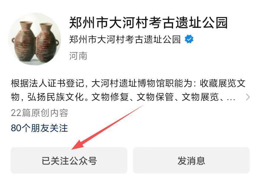 请温暖“郑州市大河村考古管事公园”官方微信公众号,点击菜单栏“参不雅预约”进行实名登记。