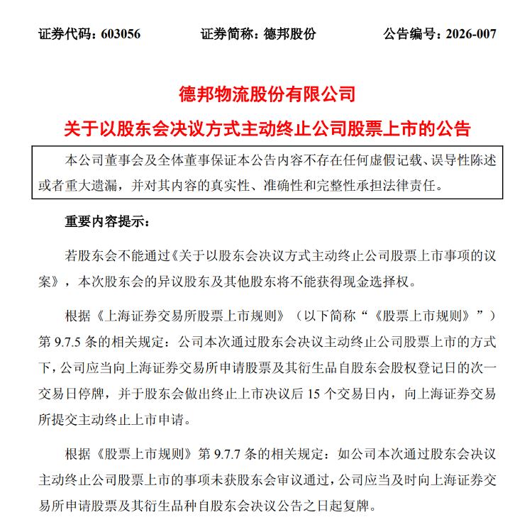 1月13日晚间,德邦股份(603056)泄漏公告称,公司拟以鼓励会决议面貌主动撤退A股股票在上交所的上市往还,公司股票于1月14日起复牌。